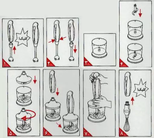 طریقه آماده کردن و روش استفاده: روش باز و بسته کردن: الف) مخلوط کن: 1- روش بستن: برای جاگذاری پایه مخلوط کن روی بدنه موتور، قسمت بالایی پایه را در قسمت سوراخ زیرین بدنه موتور قرار دهید. پایه را به سمت داخل برده و فشار دهید.زمانیکه صدای کلیک شنیده شد، پایه جا خورده است.( شکل 1 )